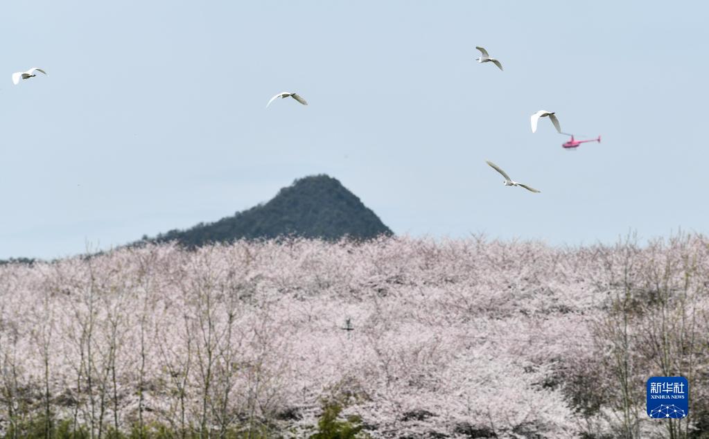 3月21日,一群鳥在貴州省貴安新區(qū)櫻花園內(nèi)飛翔。新華社記者 楊文斌 攝
