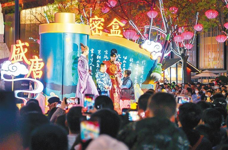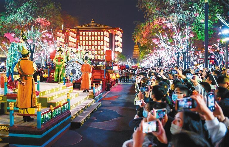 文化為旅游賦能,旅游因文化而有了靈魂。如果說大唐不夜城是西安盛唐文化的名片,那么大唐不夜城的演出則把盛唐文化真切地呈現(xiàn)在了人們的面前?!赌奚延鹨挛琛肥鞘⑻谱钊A麗的舞蹈,《花車斗彩》展示了大唐風(fēng)采,《盛唐密盒》把生活過成了段子,《華燈太白》凝結(jié)了李白的詩情與不羈,“不倒翁小姐姐”巧笑倩兮,搖出了長(zhǎng)安女子的溫柔……