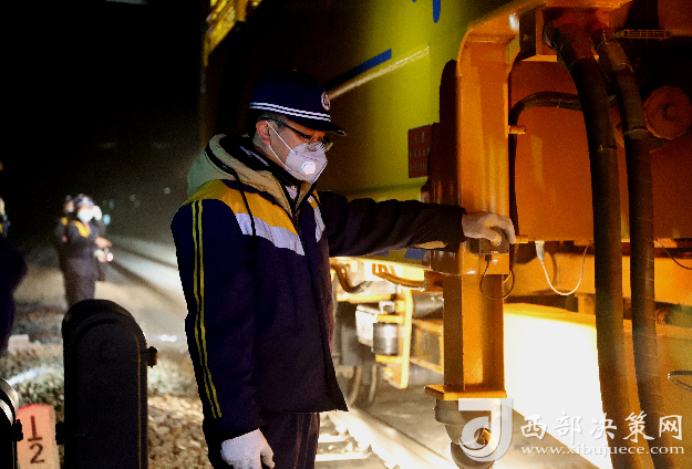 深夜,在柳家臺至古浪區(qū)間的兩臺線路搗固車發(fā)出震耳的轟鳴聲,打破了周圍的寂靜,搗固單元強有力的下插到道床深處。作業(yè)車輛的燈光點綴著夜空,黃色,紅色的燈光交織相錯,猶如一副深夜壯麗施工圖。在車下負責監(jiān)控的操作人員李偉一會握緊拳頭,一會揮動手臂和車內(nèi)操作人員進行聯(lián)控操作,確保搗固單元準確無誤的密實道床,提高線路道床的穩(wěn)定性。
