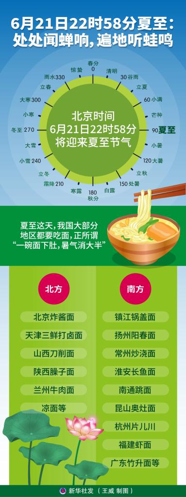 新華社天津6月20日電(記者周潤(rùn)?。?ldquo;綠筠尚含粉,圓荷始散芳”。北京時(shí)間6月21日22時(shí)58分將迎來(lái)夏至節(jié)氣,標(biāo)志著蛙鳴陣陣、蟬吟聲聲、荷韻飄香的盛夏來(lái)臨了。