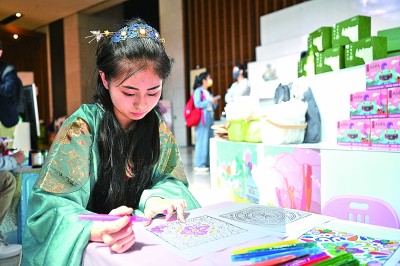 中國國家博物館內(nèi),觀眾在紙上進(jìn)行文物紋樣涂鴉。新華社發(fā)