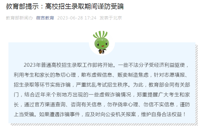 據(jù)悉,近年來,一些社會機構和個人通過網(wǎng)絡平臺發(fā)布有關涉考涉招信息,存在政策解讀不準確、信息提供不真實等問題,有的甚至通過假冒、仿冒高校和招生考試機構的官方網(wǎng)站、公眾賬號編造散布虛假信息,迷惑考生和家長,實施詐騙,嚴重擾亂考試招生秩序。