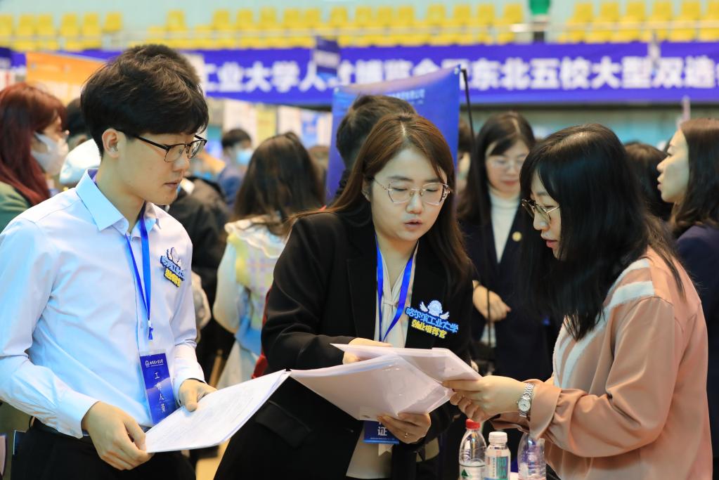 哈工大“就業(yè)推薦官”(中)向企業(yè)招聘負(fù)責(zé)人現(xiàn)場(chǎng)推薦畢業(yè)生。