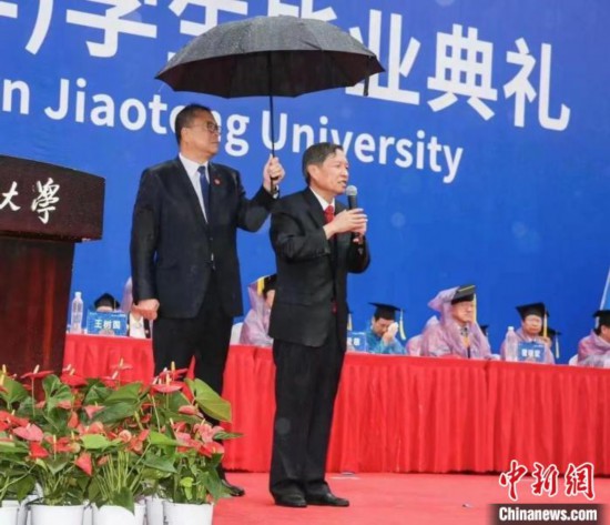 圖為西安交通大學(xué)畢業(yè)典禮當日,該校黨委書記盧建軍為校長王樹國撐傘?!∥靼步煌ù髮W(xué)供圖