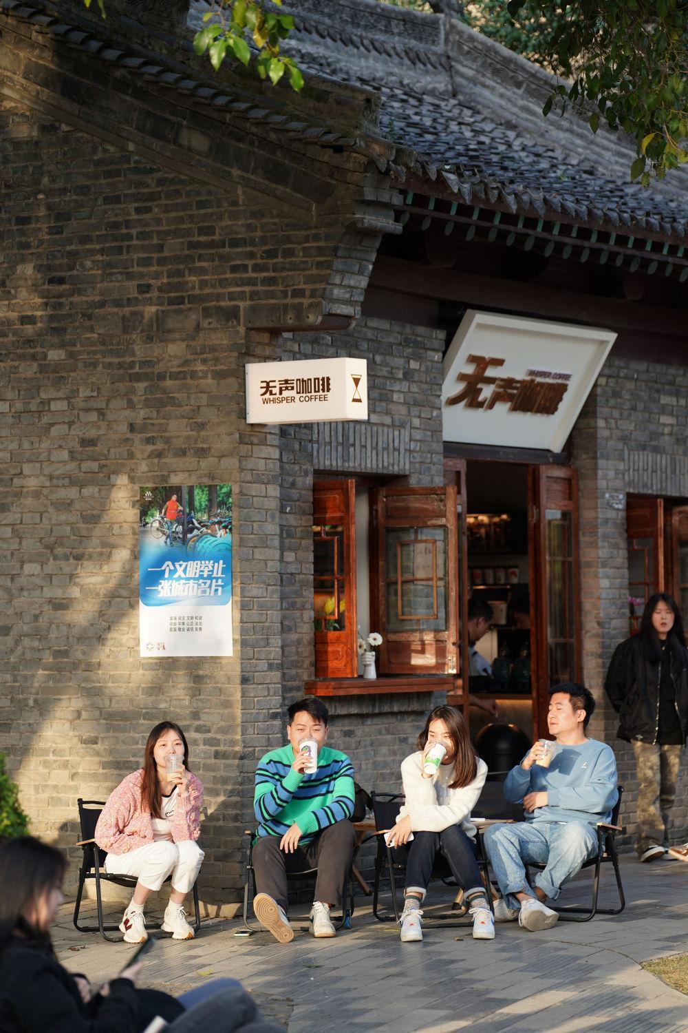 消費(fèi)者在西安城墻下的一家咖啡館旁消費(fèi)休閑(3月25日攝)。新華社記者 邵瑞 攝