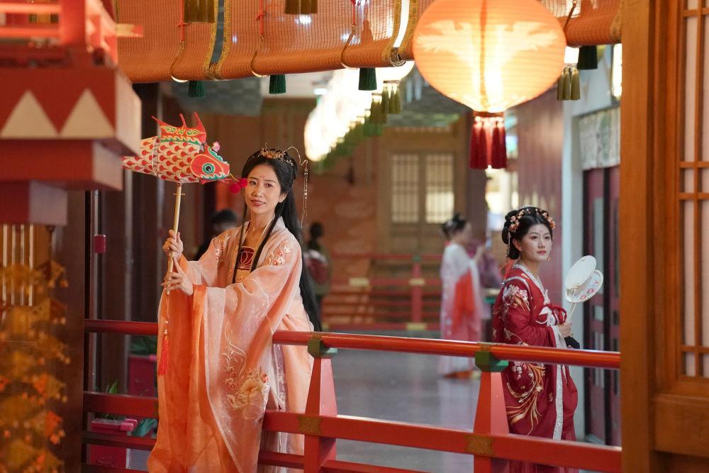 5月11日,游客在西安“長安十二時辰”主題街區(qū)內(nèi)拍照游玩。新華社記者 邵瑞 攝