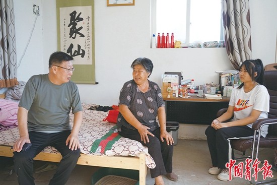 8月21日,北京市房山區(qū)石樓中學校長郭洪生(左一)來到原夏村中學初二學生索鑫雨(左三)家中,為索鑫雨和其奶奶(左二)講解入學政策。張藝/攝