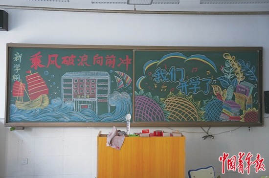 8月21日,北京市房山區(qū)石樓中學、夏村中學的師生一起畫出迎接開學的黑板報。張藝/攝