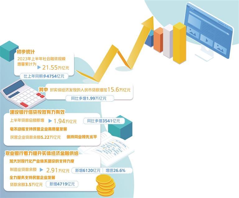 今年上半年以來,金融持續(xù)支持實體經(jīng)濟恢復(fù)發(fā)展和回升向好,金融體系對實體經(jīng)濟的支持進一步加大。初步統(tǒng)計,2023年上半年社會融資規(guī)模增量累計為21.55萬億元,比上年同期多4754億元。其中,對實體經(jīng)濟發(fā)放的人民幣貸款增加15.6萬億元,同比多增1.99萬億元。