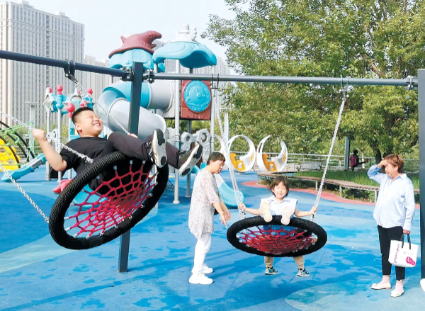 初秋,在亦莊涼水河公園,孩子們暢玩輪胎秋千。近年來,本市不少公園經(jīng)過改造提升,新增了滑索、繩網(wǎng)等新設(shè)施,變得更加“兒童友好”。 記者 甘南攝
