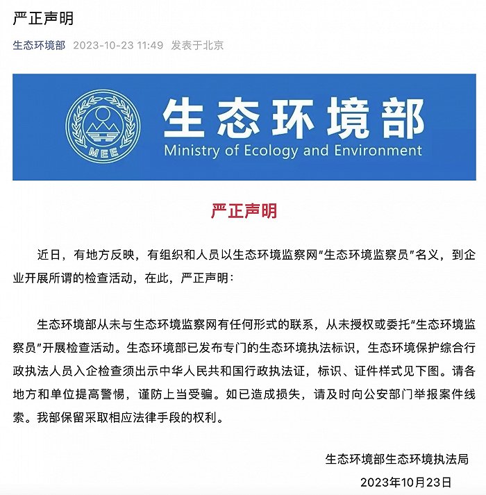 據(jù)生態(tài)環(huán)境部公眾號(hào)10月23日消息,近日,有地方反映,有組織和人員以生態(tài)環(huán)境監(jiān)察網(wǎng)“生態(tài)環(huán)境監(jiān)察員”名義,到企業(yè)開(kāi)展所謂的檢查活動(dòng),在此,生態(tài)環(huán)境部嚴(yán)正聲明: