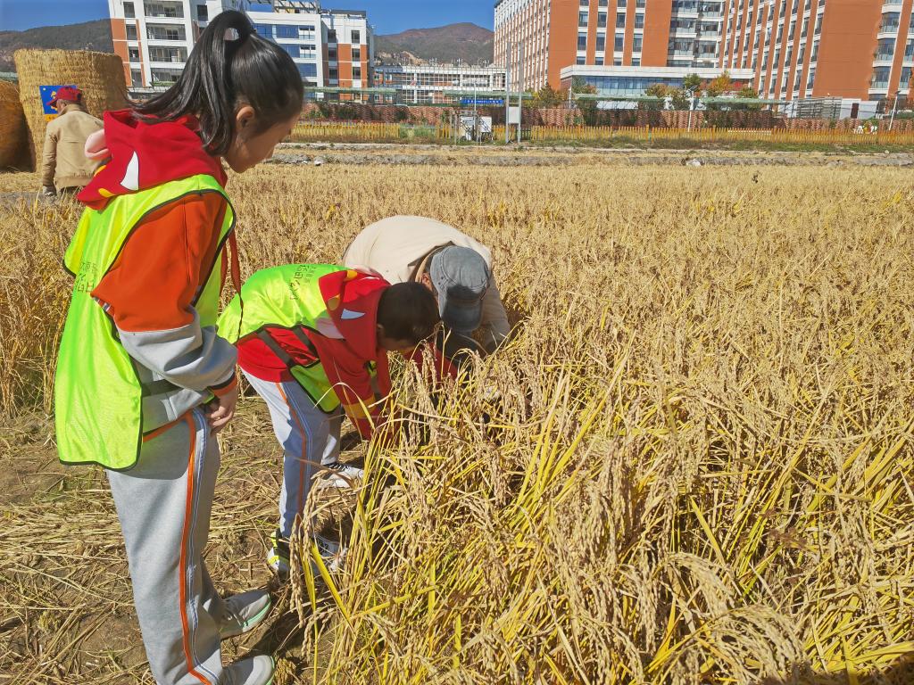 10月20日,小學生在工作人員的帶領(lǐng)下體驗收割水稻。新華社記者 魏飚 攝