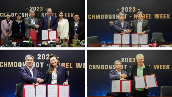 上海細(xì)胞治療集團(tuán)董事長(zhǎng)錢(qián)其軍與諾獎(jiǎng)獲得者喬治·斯穆特教授、安德烈·海姆教授及莫澤夫婦亮相“乘黃計(jì)劃諾獎(jiǎng)推廣大使”簽約現(xiàn)場(chǎng)