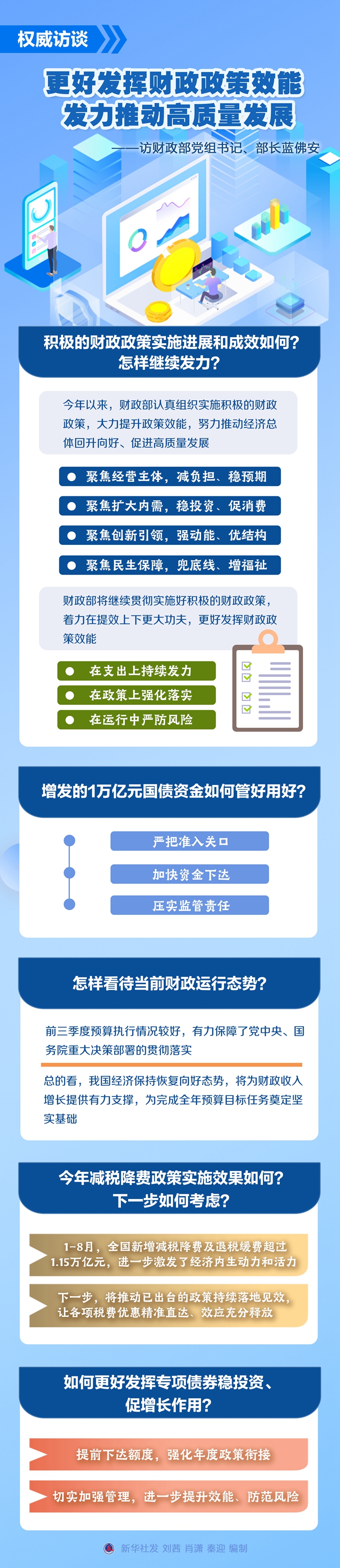 財政政策是國家宏觀調(diào)控的重要手段。下一步,財政政策還將如何發(fā)力?增發(fā)的國債怎樣用好?財政運行態(tài)勢如何?新華社記者采訪了財政部黨組書記、部長藍佛安。