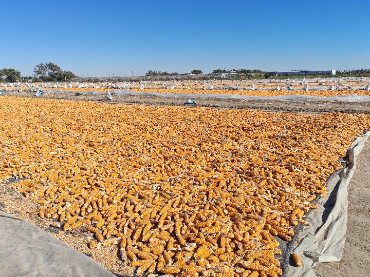 新疆昌吉回族自治州奇臺縣晾曬場上等待脫粒交售的玉米。新華社記者茍立鋒 攝