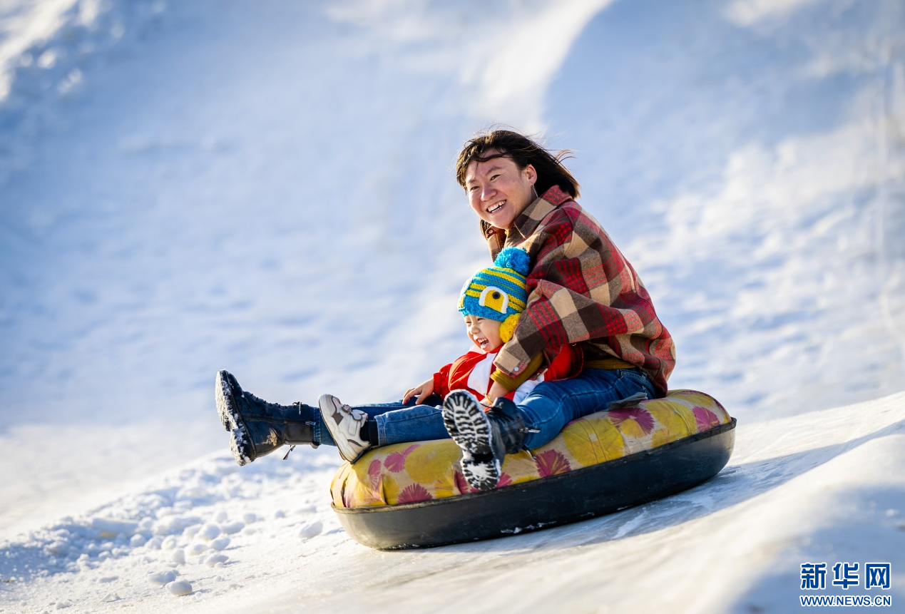 12月7日,家長陪伴孩子在呼和浩特市玉泉區(qū)大庫倫村“冰雪大世界”內(nèi)玩雪圈。新華網(wǎng)發(fā)(丁根厚 攝)