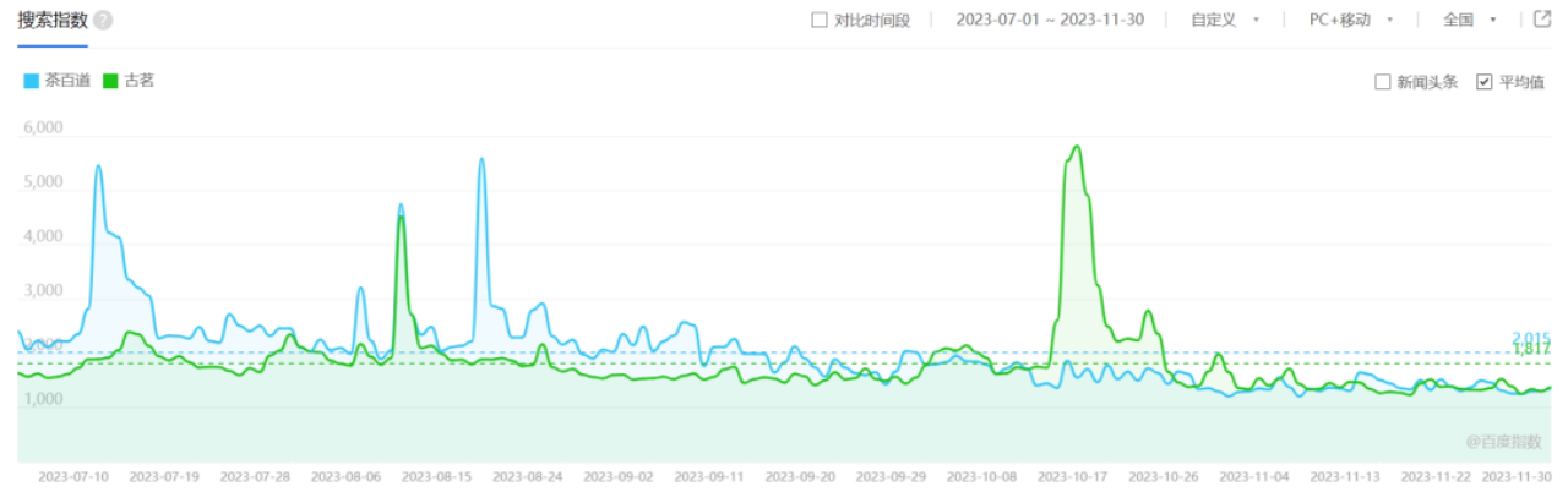以“茶百道×未定事件簿”與“古茗×天官賜福”聯(lián)名活動為例,截至11月30日,#茶百道聯(lián)名未定事件簿#、#古茗天官賜福#微博話題閱讀量分別達到1.6億、1.3億。根據(jù)百度指數(shù),在聯(lián)名活動開啟當(dāng)天,兩個茶飲品牌的搜索指數(shù)均出現(xiàn)顯著上升,皆超出今年7-11月平均值的150%以上。聯(lián)名活動已然成為茶飲品牌的流量密碼。